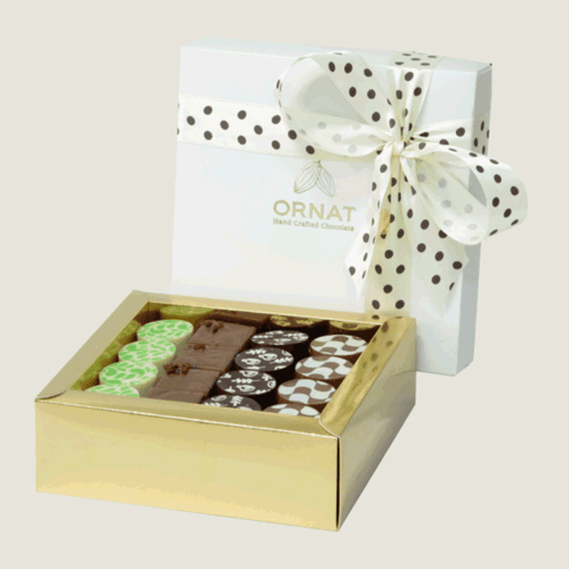מארז יוקרתי של 16 פרלינים משובחים בעבודת יד, בסגנון בלגי וצרפתי, משוקולד לבן, חלב ומריר במילויים שונים בהתאם לזמינות. טעמים יכולים לכלול וניל, שקדים, נוגט, שוקולד מריר ושבבי קקאו קלויים, תפוז, לימון, קוקוס, פיסטוק, קפה, אספרסו, אגוזי לוז, קרמל מלוח, מלח ים, קינמון וטעמים נוספים